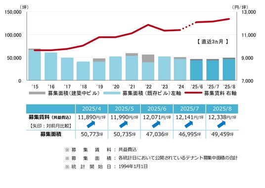 募集賃料は前月比プラス197円/坪の12,338円/坪となり、10ヵ月連続の上昇となった。大手ビルオーナーを中心に、募集賃料を引き上げる動きが見られる。