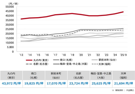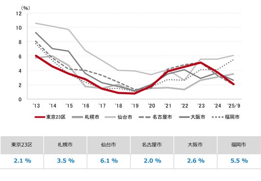 三幸エステート株式会社(本社:東京都中央区、取締役社長:福島正二郎)は、2025年9月度の東京都心5区(千代田区、中央区、港区、新宿区、渋谷区)および全国6大都市(東京、札幌、仙台、名古屋、大阪、福岡)の大規模ビル※1のマーケットデータをまとめた「オフィスマーケット2025年10月号」を公表します。