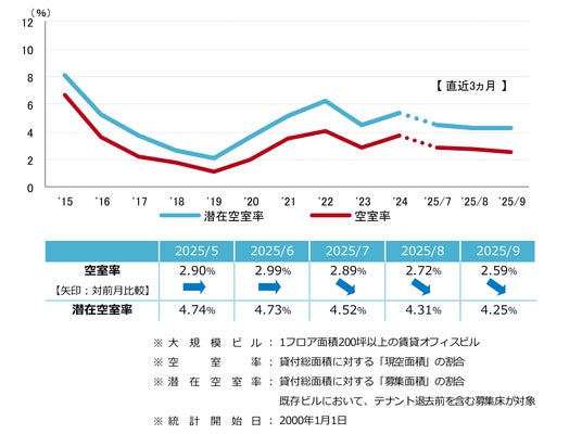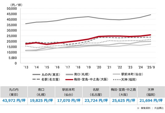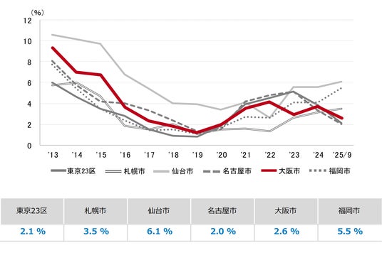 三幸エステート株式会社(本社:東京都中央区、取締役社長:福島正二郎)は、2025年9月度の大阪市オフィス賃貸状況(空室率&現空面積:大規模、募集賃料&募集面積:大規模、規模別空室率、主要3区※1空室率:大規模)および全国6大都市(東京・札幌・仙台・名古屋・大阪・福岡)の大規模ビルのマーケットデータをまとめた「オフィスマーケット2025年10月号大阪」を公表します。