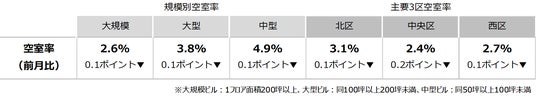 空室率は前月比マイナス0.13ポイントの2.59%となり、3ヵ月連続で低下した。主要エリアの新築ビルや築年数の経過したビルで空室消化が進み、主な低下要因となっている。エリア別では「北区」で2022年1月以来の2%台が目前に迫っている。潜在空室率は前月比マイナス0.06ポイントの4.25%だった。
