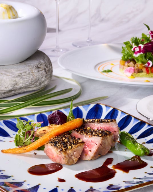 五島列島は、長崎県の西方に浮かぶ、大小140以上の島々からなる自然豊かな地域です。 多種多様な魚が獲れる豊かな漁場や、幻の黒毛和牛「五島牛」、ブランド豚「五島美豚」、椿油や海水を使った独自の農法による「椿やさい」、伝統的な手延べ製法を用いた「五島うどん」など、さまざまな食文化があります。 スタジアムシティホテル長崎では、ホテルレストランの各シェフたちが五島の食材を活かした特別メニューを考案いたしました。 ここでしか味わえない逸品をぜひお楽しみください。