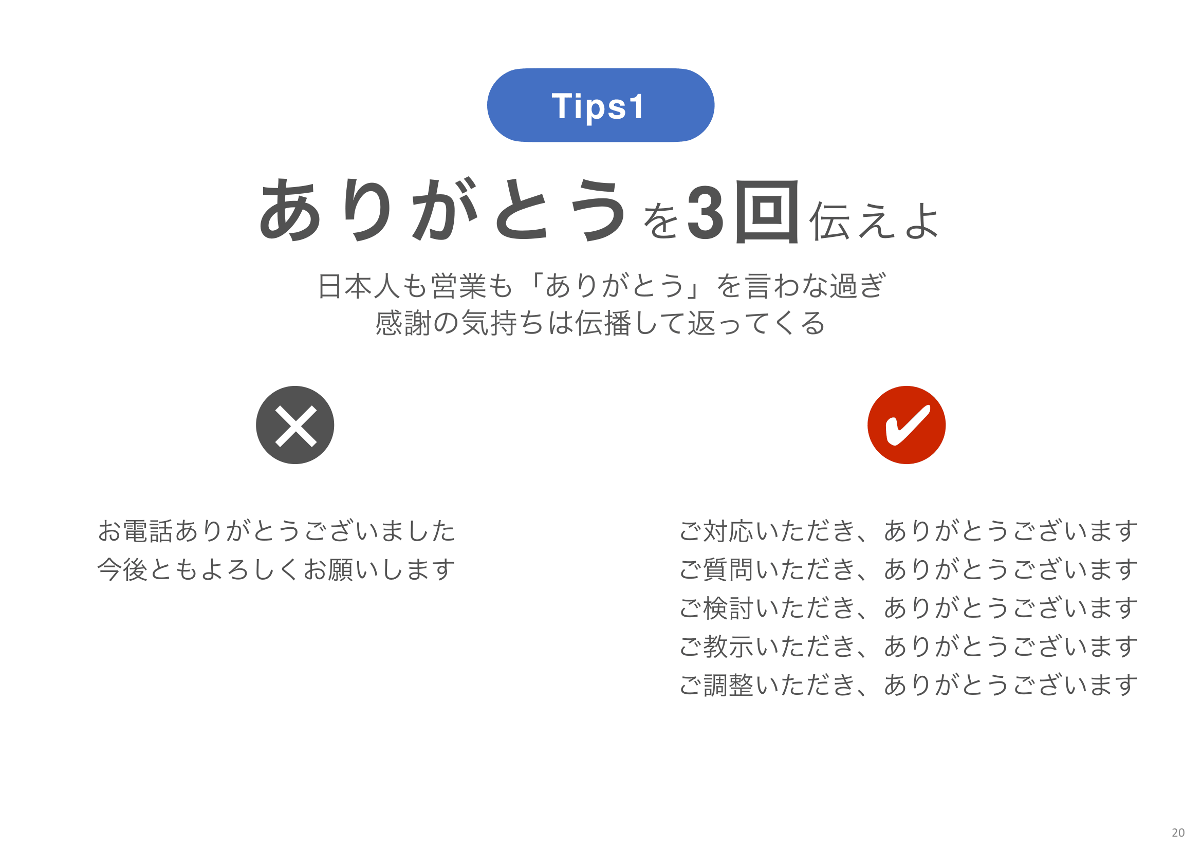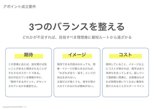担当者に代わっていただいてからは、40秒以内に日程の打診まで到達することを基準とし、具体的な日時を2つ提示します。質問やお断りに対しては「ありがとうございます」を3秒以内に返し、アポイントの打診はお伺い調ではなく「お願いします」と言い切る。さらに「ありがとう」「お願いします」「日程」をもう一押しトークとして1回の電話で3回伝え、商談化の確度を高めます。