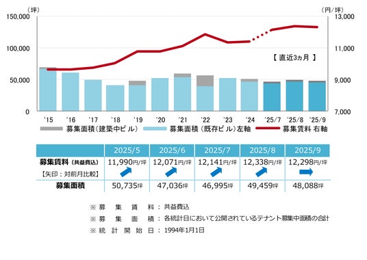 募集賃料は前月比マイナス40円/坪の12,298円/坪となった。11ヵ月ぶりで下落したものの小幅な動きに止まり、12,000円/坪台前半で推移している。