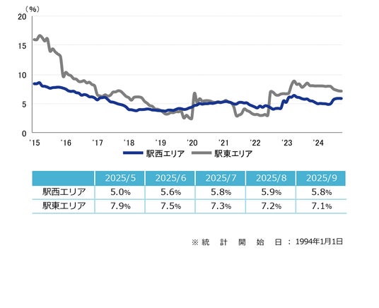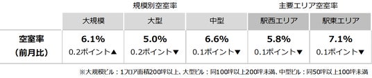 空室率は前月比マイナス0.02ポイントの6.14%となり、前月からほぼ横ばいだった。貸止めになっていたビルでの募集再開により現空床が生じた一方、周辺エリアからの移転や館内増床で空室が消化され、前月からはわずかな動きに止まっている。潜在空室率は前月比マイナス0.05ポイントの7.32%だった。