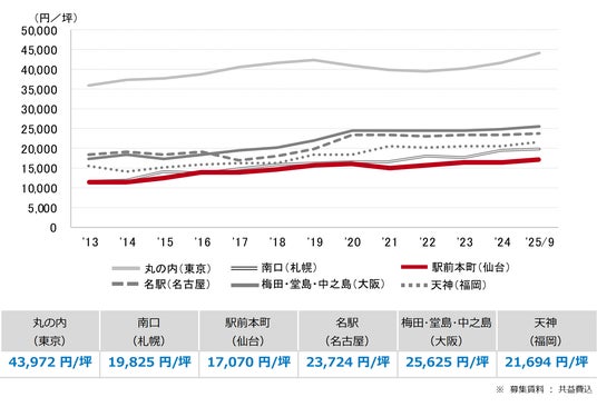 三幸エステート株式会社(本社:東京都中央区、取締役社長:福島正二郎)は、2025年9月度の仙台市オフィス賃貸状況(空室率&現空面積:全規模、募集賃料&募集面積:全規模、規模別空室率、主要エリア※1空室率:全規模)および全国6大都市(東京・札幌・仙台・名古屋・大阪・福岡)の大規模ビルのマーケットデータをまとめた「オフィスマーケット2025年10月号仙台」を公表します。