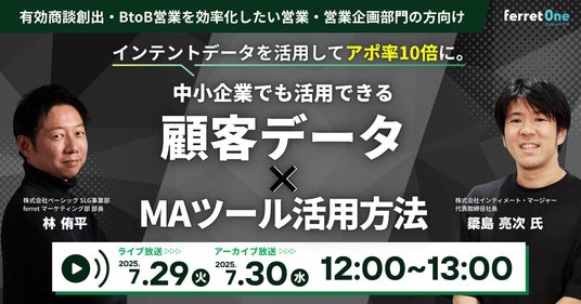BtoBマーケティングのお困りごとをまるっと解決するサービス『ferret One(フェレットワン)』を運営する株式会社ベーシック(本社:東京都千代田区、代表取締役:秋山勝)は、7/29(火)12時よりBtoB企業で営業を効率化させたい営業・営業企画の方に向けたセミナー「インテントデータを活用してアポ10倍に。中小企業でも活用できる顧客データ×MAツール活用方法」を開催いたします。