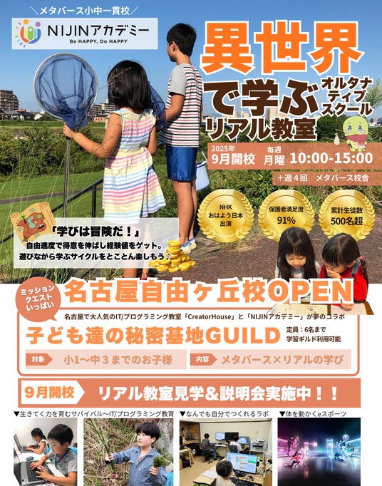 株式会社NIJIN(本社:東京都江東区、代表取締役:星野達郎)が運営する、不登校オルタナティブスクール『NIJINアカデミー』は、愛知県名古屋市千種区にリアル教室『NIJINアカデミー名古屋自由ヶ丘校』を2025年9月1日(月)に新規開校いたします。