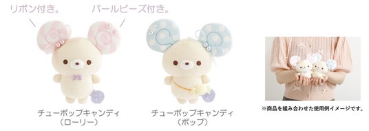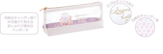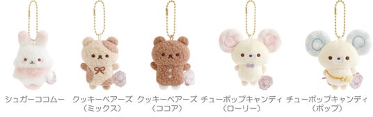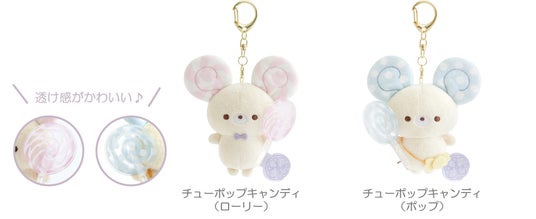 今回は、シュガーココムーとなかよしの双子“チューポップキャンディ”の“ローリー”と“ポップ”が初メインとなるテーマです。内側がキャンディ柄のペンポーチや、本物のキャンディみたいなアクリルキーホルダー、本物のキャンディみたいなマスコットをもったぶらさげぬいぐるみなどがラインナップします。