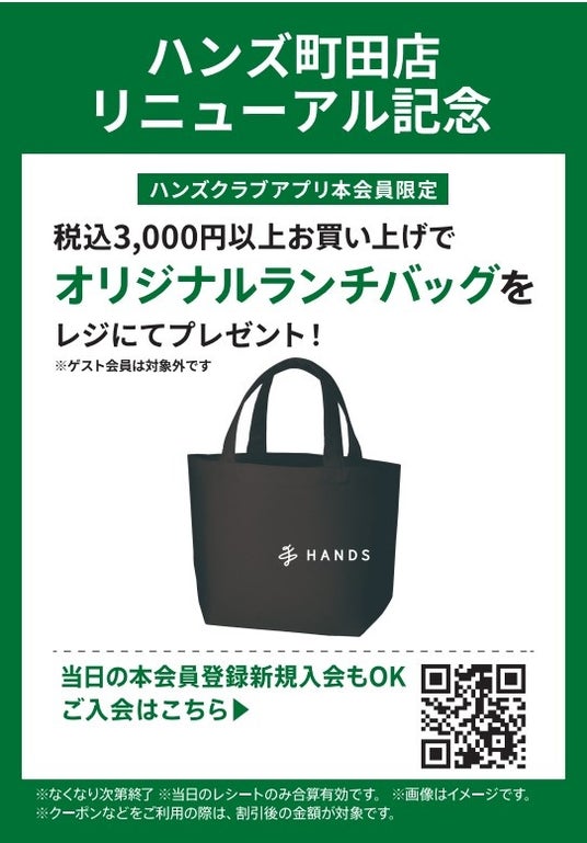 3月8日(日)までの期間中、ハンズクラブアプリ本会員様限定で、町田店で税込3,000円以上お買い上げいただくと、「オリジナルランチバッグ」をプレゼント。