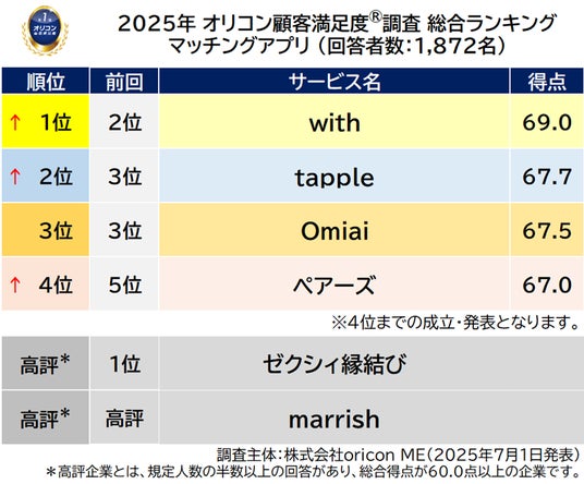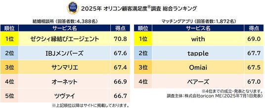 『結婚相談所』『マッチングアプリ』総合ランキング(2025年 オリコン顧客満足度(R)調査)