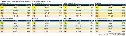 『マッチングアプリ』評価項目別ランキング(2025年 オリコン顧客満足度(R)調査)