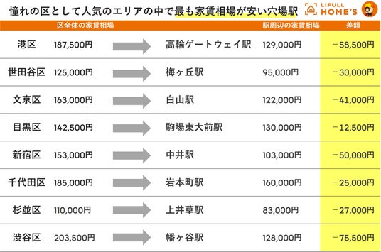 そこでLIFULL HOME'Sでは「住んでみたい憧れの区」を調査するとともに、その中でも比較的手が出しやすい家賃相場が安い穴場駅を調査しました。今後の住まい探しにぜひお役立てください。