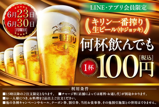 株式会社モンテローザ(本社:東京都杉並区、代表取締役:大神輝博)は、2025年6月23日(月)、6月30日(月)の2日間、魚民・目利きの銀次・山内農場・千年の宴などの全国の当社対象店舗(※)で、LINE・アプリ会員限定「キリン一番搾り生ビール何杯飲んでも1杯100円セール」を実施します。