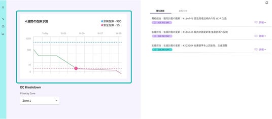 図2:欠品リスクがある製品をAIが抽出し、在庫状況と将来予想を表示