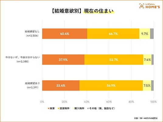 1都3県在住の20~40代未婚男女を対象にしたインターネットアンケートで、結婚願望と今の住まいについて聞いたところ、「実家暮らし」の割合が結婚願望なしが最も高く(40.4%)、結婚願望あり(33.4%)と約7ptの差異が出ました。また、「購入物件」の割合も結婚願望なしが最も高かった(9.7%)一方で、結婚願望ありの人でも7.5%いることが分かりました。