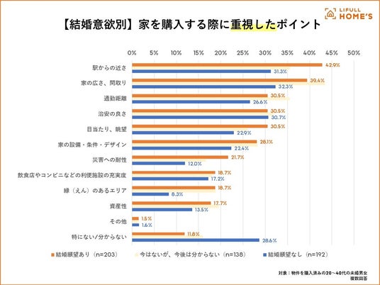 既に物件を購入している人に対し重視したポイントを聞いたところ、「特にない/分からない」と回答した割合が結婚願望ありは11.8%だったのに対し、結婚願望なしは28.6%にも上りました。全体的に各項目に対する選択割合も結婚願望ありの方が多く、結婚意欲のある人の方が家に対するこだわりが強いことがうかがえました。