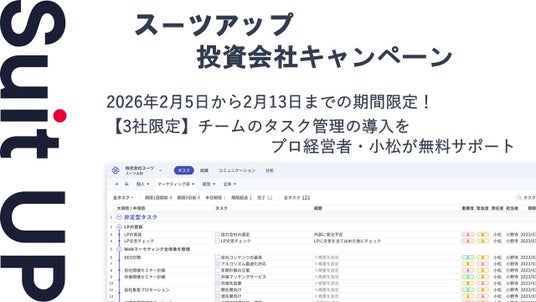 2026年2月5日から2月13日までの期間に、スーツアップの無料お試しにお申込みいただきました投資会社でチームのタスク管理を導入する予定のうち3社限定で、当社代表者であり中小・中堅企業やスタートアップのバリューアップに実績のあるプロ経営者の小松自ら、チームのタスク管理の導入サポートを無料で行うキャンペーンを実施します。
