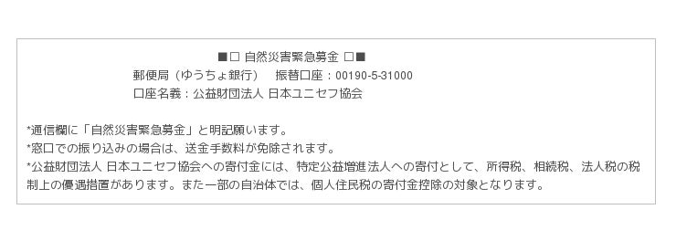 日本ユニセフ協会は、エクアドルの地震被害に対応するユニセフの活動を支える緊急募金を受け付けています。報道関係の皆様におかれましては、ユニセフ『自然災害緊急募金』の告知にご協力いただけますよう、お願いいたします。