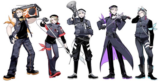 メンバーは、左から 隈取、狐、般若(リーダー)、おかめ、阿形。