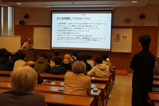 NICTナショナルサイバートレーニングセンター長園田氏の講演/学生との質疑応答の様子