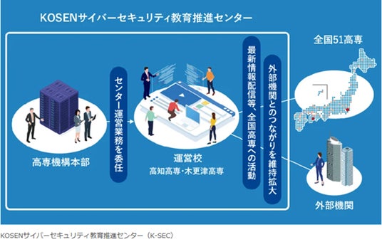 これまで高専の行ってきたサイバーセキュリティ教育を更に高度化し、以下の取組を中心に、これからのサイバー空間とフィジカル空間が融合した社会に求められる人材の育成に貢献するため、高専機構本部にKOSENサイバーセキュリティ教育推進センターが設置され、木更津高専と高知高専が運営校となっています。