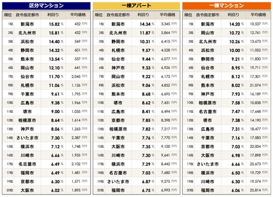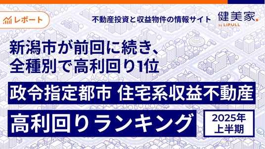 事業を通して社会課題解決に取り組む株式会社LIFULLのグループ会社であり、不動産投資と収益物件の情報サイト「健美家(以下、健美家)」および「LIFULL HOME'S 不動産投資」を運営する健美家株式会社(代表取締役社長:倉内 敬一)は、2025年1月~6月期に登録された全国の住宅系収益不動産3種別(区分マンション・一棟アパート・一棟マンション)を集計し、政令指定都市別の利回りを「政令指定都市 高利回りランキング」として公開しました。