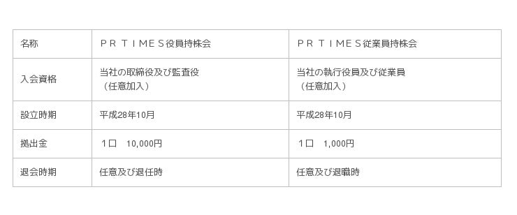 株式会社PR TIMES(所在地:東京都港区、代表取締役:山口拓己、東証マザーズ:3922)は、このたび役員持株会及び従業員持株会を設立し、平成28年11月より継続的に当社株式を購入することといたしましたので、下記のとおりお知らせいたします。