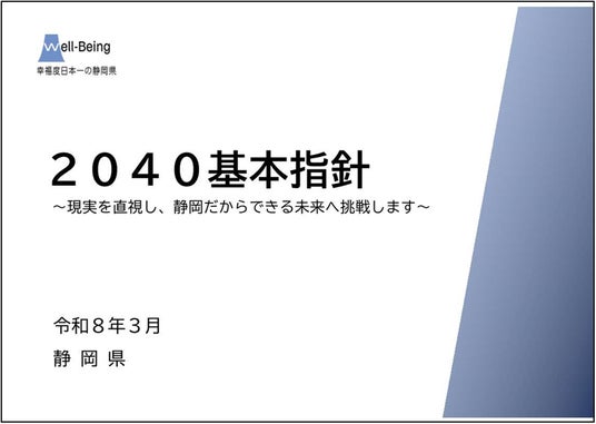 人口減少への「適応対策」を進めるため、静岡県の将来像や各分野の施策の方向性を示す「2040(ニーマルヨンマル)基本指針」を策定しました。現実を直視し、静岡だからできる未来へ挑戦します。