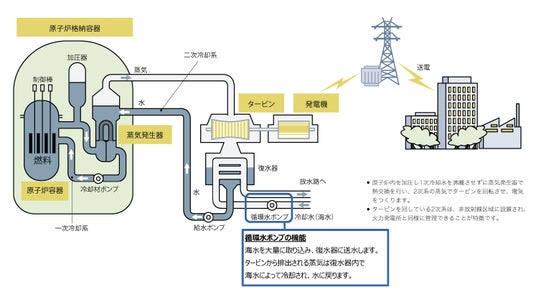 なお、循環水ポンプとは、加圧水型軽水炉の2次系系統の中でタービンから排出される蒸気を冷却し、水に戻す復水系統で用いられるポンプです。蒸気を冷やすために、取水源より大量の水を吸い上げ、復水器に送り込む機能が必要なことから、大型のポンプとなります。当社は、国内外に延べ500基以上の循環水ポンプの供給実績があります。