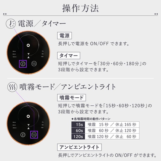 30分、60分、180分のタイマー設定が可能で、香りの調整ができ、就寝時や外出時にも安心して使用できます。