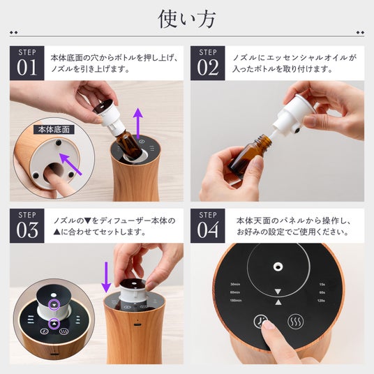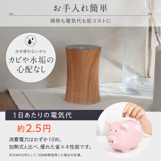 水を使わず、エッセンシャルオイルの純粋な香りをそのままお部屋に広げることができます。