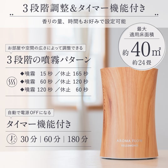 ベルモンドの水が不要のアロマディフューザー【AROMA FLOW】が楽天市場アロマディフューザーカテゴリ1位を獲得。リビングや寝室、玄関やオフィスまであらゆる空間に馴染む、ナチュラルなデザインが人気。