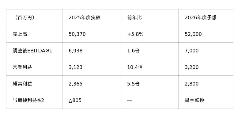 2025年度営業利益は前年比10倍超の31億円、売上高も504億円と過去最高を更新。2026年度は当期純利益の黒字転換を目指しつつ、成長投資の強化で事業成長を加速