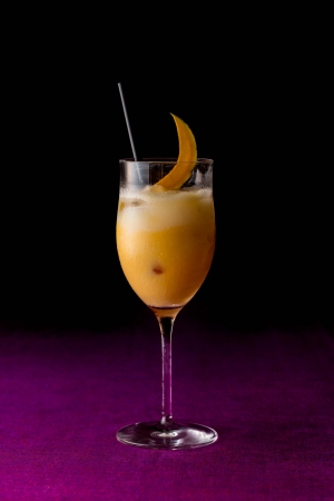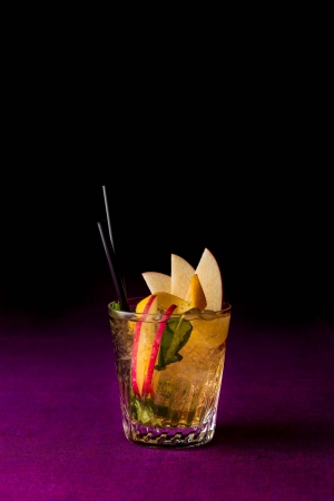 熟成した香りが魅力のウィスキーがベースのカクテルです。キャラメルシロップの甘さとリンゴの香りとジンジャーのアクセントを添えてご提供いたします。フレッシュのリンゴとオレンジ、ミントを添えて。