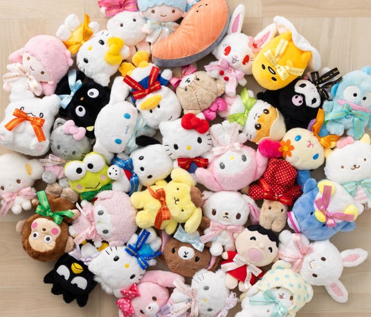 各キャラクターのロゴプリント入りリボンが付いたぬいぐるみと、