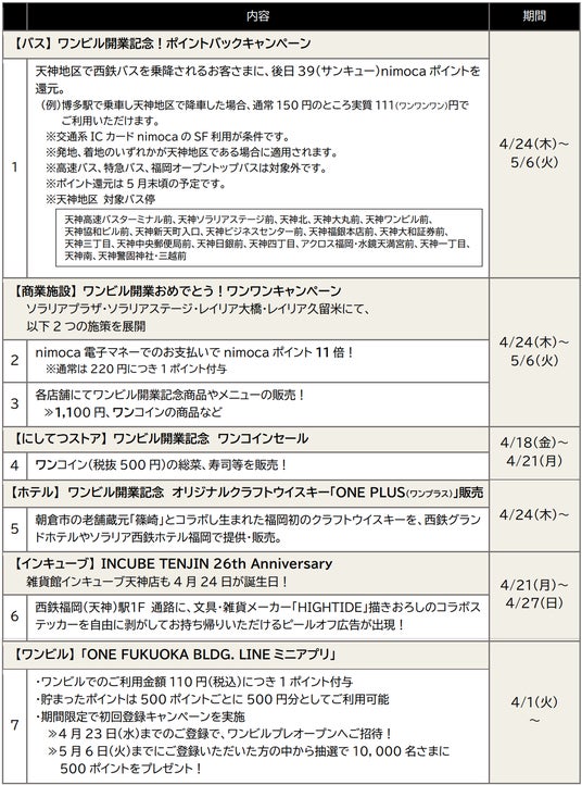 お客さまへの感謝の気持ちを込めて、天神地区で西鉄バスを乗降されるお客さまには39(サンキュー)nimocaポイントを還元するほか、天神のソラリアプラザやソラリアステージ、西鉄電車沿線のレイリア大橋やレイリア久留米で、ワンビルの「ワン」にちなんだnimocaポイント施策や「ワンコイン」・「1千円」の開業記念商品の販売等を行います。