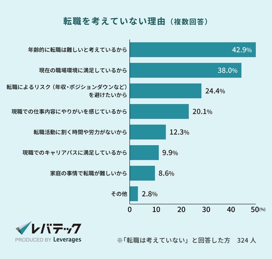 一方で、40代以上のIT人材のうち、約7割が転職を考えていないことが分かりました。その理由としては「年齢的に転職が難しいと感じる(42.9%)」が最も多く、ついで「現在の職場環境に満足している(38.0%)」「転職によるリスク(年収・ポジションダウンなど)を避けたいから(24.4%)」と続きます。