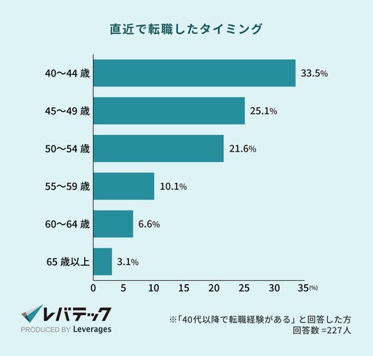 40代以降で転職経験がある方に対し、直近の転職時期を尋ねたところ、「40~44歳(33.5%)」「45~49歳(25.1%)」「50~54歳(21.6%)」が多数を占めており、特に40~50代の転職が活発であることが分かります。