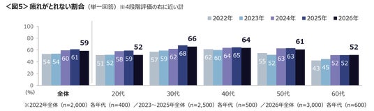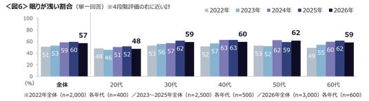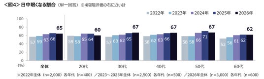 良好ではない睡眠状態を年代別見ると、「日中眠くなる」が30~50代、「疲れがとれない」は30~40代、「眠りが浅い」は50代で多い。「日中眠くなる」は30~40代において、2022年より増加傾向が続いている。<図4~6>