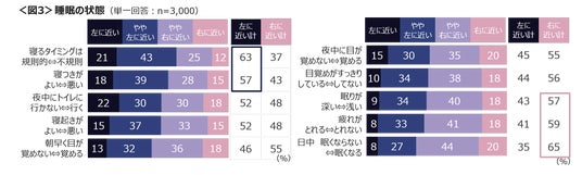 睡眠状態の詳細は、「寝るタイミングは規則的」63%、「寝つきがよい」57%と良好な人もいるものの、「日中眠くなる」65%、「疲れがとれない」59%、「眠りが浅い」57%と良好ではない人の方が多い。<図3>