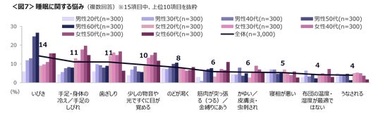 睡眠時の悩みごとは、「いびき」「手足・身体の冷え/手足のしびれ」「歯ぎしり」がTOP3。男性50~60代の「いびき」、女性40~60代は「手足・身体の冷え/手足のしびれ」、女性20~50代の「歯ぎしり」が悩みとして多い。<図7>