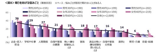 悩みごとが原因で眠れない人の眠りを妨げる悩みごとは、「お金・収入・貯金」「学校や仕事」「人間関係」がTOP3。「お金・収入・貯金」「人間関係」は女性で、「学校や仕事」は男性の割合が高い。<図8>
