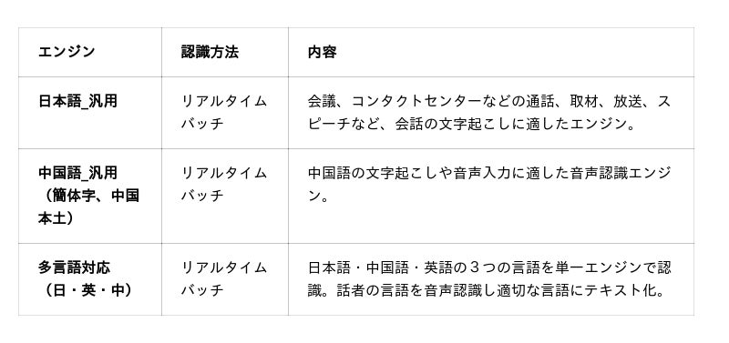 なお、「AmiVoice API」にて提供しているEnd to End方式の音声認識エンジンは、日本語・中国語・多言語(日・英・中を単一エンジンで認識)の汎用向け音声認識エンジンです。「単語登録」機能は、これら全ての音声認識エンジンでご利用いただけます。