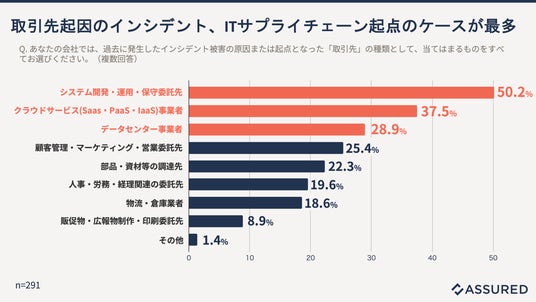 さらに、インシデントの起点となった取引先としては、「システム開発・運用・保守委託先」(50.2%)が最も多く、次いで「クラウドサービス事業者」(37.5%)、「データセンター事業者」(28.9%)が続きました。これは、企業活動において、なくてはならないITシステムやクラウドサービスに関連する取引先が起因となりやすく、ITサプライチェーン全体でのリスク対応が喫緊の課題となっていることを示しています。