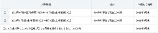 ⇒さらに、1.の入金対象のお客様が2.も達成された場合には、現金2,000円を上乗せ!(特典付与時期2025年9月末)