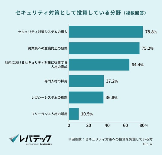 投資している分野としては「セキュリティ対策システムの導入(78.8%)」や「従業員への意識向上の研修(75.2%)」が上位に挙がりました。さらに「社内におけるセキュリティ対策に従事する人材の育成(64.4%)」も6割を超えており、セキュリティ人材の確保・育成への関心の高さがうかがえます。レバテックの保有するデータ*1では「セキュリティ」の転職求人倍率が54倍と他カテゴリと比較しても極めて高く、企業が採用に苦戦している状況です。こうした状況を受け、社内人材育成に注力する企業も存在するのではないでしょうか。