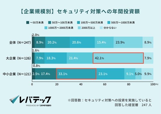 経営層に対し、セキュリティ対策における年間投資額を聞くと、最も多かったのは「2,000万以上(23.9%)」でした。従業員数1,000人以上の大企業では「2,000万以上(42.1%)」、中小企業では「100万以上500万未満(33.1%)」が最多となり、企業規模によって顕著な差が見られました。