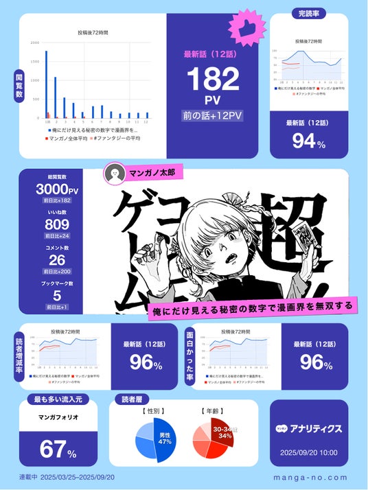 ◆「作品を置いておくだけで、色んな角度から分析してもらえてうれしい。作品ごとに読者の傾向がかなり違うことにびっくりしました。 他のマンガノ作品の平均と比べることができるので、僕は完読率が高いのが武器なのかなという気付きがありました。 また、分析レポートシェア機能が楽しいので手軽にSNSでシェアしたくなります。」(納豆まぜお)