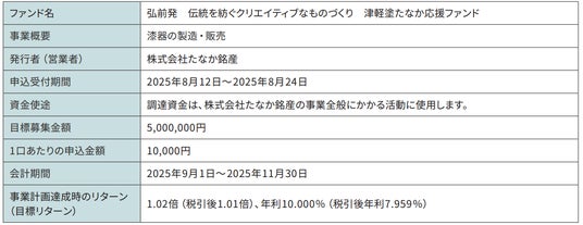 ソニー銀行株式会社(代表取締役社長:南 啓二/本社:東京都千代田区/以下 ソニー銀行)は、2025年8月12日(火)より投資型クラウドファンディングのプラットフォーム「Sony Bank GATE」において、株式会社たなか銘産を営業者として出資募集の取扱を開始しますので、お知らせします。なお、青森県内企業として初の Sony Bank GATE ファンド組成となります。