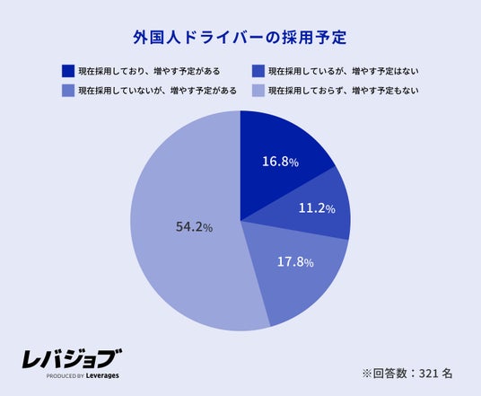 レバレジーズ株式会社が運営するエッセンシャルワーカー向けキャリア支援サービス「レバジョブ」は、物流・旅客事業のドライバー採用担当者・経営者321名を対象に、外国人ドライバーの採用に関する実態調査を実施しました。